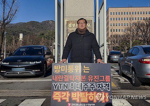 (과천=연합뉴스) 나확진 기자 = 전준형 언론노조 YTN 지부장이 8일 방송미디어통신위원회가 있는 경기 과천시 정부과천청사 앞에서 유진그룹의 YTN 최대주주 자격 박탈을 주장하며 1인시위를 하고 있다. 앞서 서울행정법원은 지난달 28일 YTN 최대주주를 유진이엔티로 변경하도록 승인한 옛 방송통신위원회(현 방미통위) 처분을 취소하라는 1심 판결을 했고, 유진