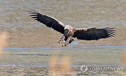 (강릉=연합뉴스) 유형재 기자 = 8일 강원 강릉시 남대천에서 대형 맹금류인 겨울 철새 흰꼬리수리가 날카로운 발톱을 세우고 물고기 사냥을 시도하고 있다. 흰꼬리수리는 환경부 멸종위기 야생생물 I급이자 천연기념물로 국내에서는 드물게 관찰된다. 2025.12.8 yoo21@yna.co.kr ▶제보는 카카오톡 okjebo ▶연합뉴스 앱 지금 바로 다운받기~ ▶네
