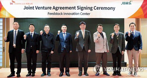 (서울=연합뉴스) SK케미칼은 10일 중국의 플라스틱 재활용 전문기업 커린러와 함께 폐플라스틱 처리 시설인 '리사이클 원료 혁신센터' 건설을 위한 합작법인을 설립한다고 밝혔다. 안재현 SK케미칼 사장(왼쪽 다섯 번째)과 정재준 SK 산터우 동사장(왼쪽 여섯 번째), 장시정 커린러 사장(왼쪽 첫 번째) 및 관계자들이 협약을 마치고 기념 촬영하고 있다. 202