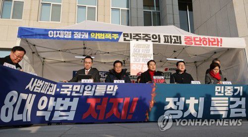 (서울=연합뉴스) 이동해 기자 = 국민의힘 장동혁 대표(오른쪽 세번째)가 15일 국회 본청 앞 더불어민주당의 쟁점 법안 추진을 저지하기 위한 천막 농성장에서 열린 최고위원회의에서 발언하고 있다. 2025.12.15 eastsea@yna.co.kr ▶제보는 카카오톡 okjebo ▶연합뉴스 앱 지금 바로 다운받기~ ▶네이버 연합뉴스 채널 구독하기 <저작권자(c