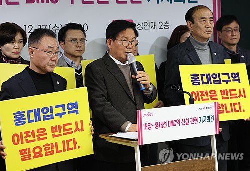 (서울=연합뉴스) 서명곤 기자 = 박강수 마포구청장이 17일 서울 중구 상연재에서 연 대장∼홍대 광역철도(대장홍대선) DMC역 신설과 관련한 기자회견에서 "DMC 환승역 설치를 촉구하고 지자체 원인자 부담 설치가 현실성이 없다"고 밝히고 있다. 대장홍대선은 부천 대장신도시와 서울 도시철도 2호선 홍대입구역을 연결하는 총 20.1㎞의 광역철도다. 총사업비 2
