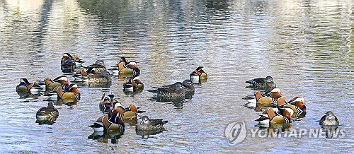 (남원=연합뉴스) 한겨울인데도 18일 전북 남원시 광한루원 연못에 원앙들이 떼를 지어 한가롭게 노닐고 있다. 광한루원 원앙은 보통 겨울을 난 뒤 초봄에 떠났으나, 몇해 전부터 텃새화하며 연중 머물고 있고 최근에는 그 수가 100여마리로 불었다. 2025.12.18 [남원시 제공. 재판매 및 DB 금지] doin100@yna.co.kr ▶제보는 카카오톡 ok