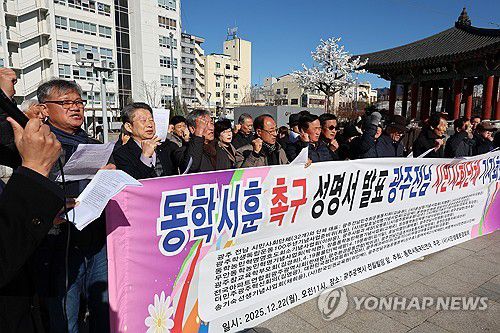 (광주=연합뉴스) 조남수 기자 = 22일 광주 동구 5·18민주광장에서 광주ㆍ전남시민사회단체가 동학서훈 촉구 성명서 발표 기자회견하고 있다. 2025.12.22 iso64@yna.co.kr ▶제보는 카카오톡 okjebo ▶연합뉴스 앱 지금 바로 다운받기~ ▶네이버 연합뉴스 채널 구독하기 <저작권자(c) 연합뉴스, 무단 전재-재배포, AI 학습 및 활용 금지