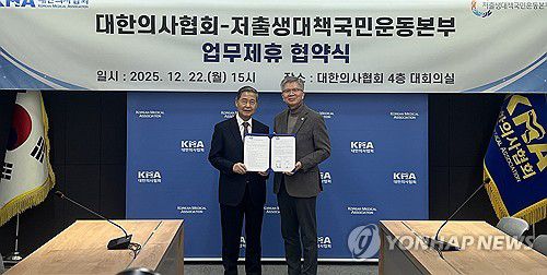 (서울=연합뉴스) 김택우 대한의사협회장(오른쪽)과 감경철 저출생대책국민운동본부 본부장이 22일 서울 용산구 대한의사협회에서 열린 '저출생 위기 극복'을 위한 업무협약을 체결한 후 기념 촬영하고 있다. 2025.12.22 [대한의사협회 제공. 재판매 및 DB 금지] photo@yna.co.kr ▶제보는 카카오톡 okjebo ▶연합뉴스 앱 지금 바로 다운받기~