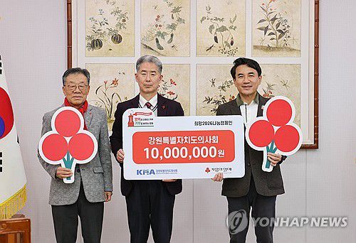 (춘천=연합뉴스) 24일 강원특별자치도청에서 강원특별자치도의사회가 희망2026나눔캠페인 성금 1천만원을 전달하고 있다. 이번 성금은 연말연시 추위와 경제적 어려움으로 고통받는 도내 취약계층을 지원하기 위해 의사회 회원들이 뜻을 모아 마련했다. 사진은 이정열 도 의사회 회장, 김진태 도지사, 유계식 강원사회복지공동모금회장이 기념 촬영을 하는 모습. 2025.