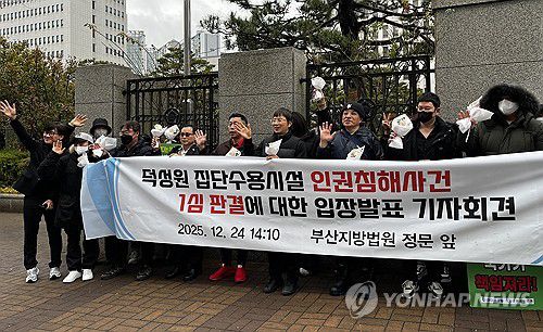 (부산=연합뉴스) 김재홍 기자 = 부산 아동보호시설 덕성원의 인권유린 피해자들이 24일 오후 부산지법 앞에서 기자회견을 열고 국가와 부산시를 상대로 제기했던 손해배상 청구 소송 승소에 대한 입장을 밝히고 있다. 부산지법 민사11부는 이날 선고 공판에서 국가와 부산시가 원고들의 청구액 460억원 중 390억원을 지급하라고 판결했다. 2025.12.24 pit