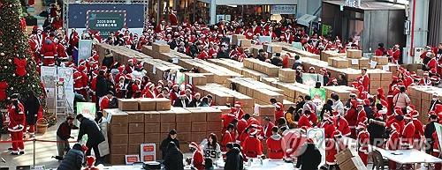 (인천=연합뉴스) 임순석 기자 = 크리스마스인 25일 인천 중구 상상플랫폼에서 열린 '2025 미추홀 산타클로스 축제'에 참석한 자원봉사자들이 소외 계층에게 전달할 선물 상자를 수령하고 있다. 이날 발대식을 마친 미추홀 산타클로스는 인천지역 소외 계층 2000가정에 겨울 이불, 생활용품 선물 세트, 떡국 밀키트 등으로 구성된 선물 상자를 전달했다. 2025