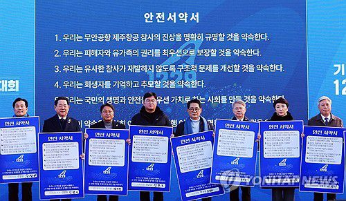 (광주=연합뉴스) 정다움 기자 = 12·29 제주항공 여객기 참사 1주기를 이틀 앞둔 27일 오후 광주 동구 5·18 민주광장에서 열린 1주기 광주·전남 추모대회에서 광주, 전남 지역 국회의원들이 안전서약서를 서명한 뒤 기념사진을 찍고 있다. 2025.12.27 daum@yna.co.kr ▶제보는 카카오톡 okjebo ▶연합뉴스 앱 지금 바로 다운받기~ ▶