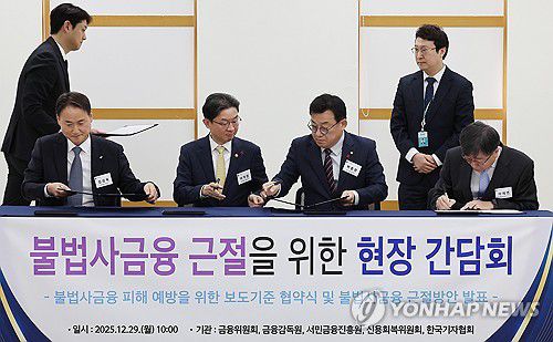 (서울=연합뉴스) 김주형 기자 = 이억원 금융위원장이 29일 서울금융복지상담센터 중앙센터에서 열린 불법사금융 근절 현장간담회에서 각 기관장과 협약서에 서명하고 있다. 왼쪽부터 김성욱 금융감독원 부원장보, 이억원 금융위원장, 박종현 한국기자협회장, 이재연 서민금융진흥원장. 2025.12.29 kjhpress@yna.co.kr ▶제보는 카카오톡 okjebo ▶