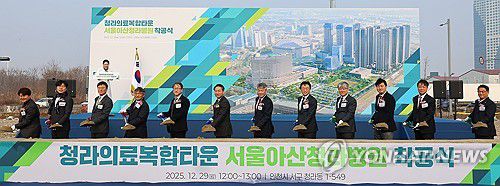 (인천=연합뉴스) 임순석 기자 = 29일 인천 서구 청라동 병원 부지에서 열린 청라의료복합타운 에서 유정복 인천시장(왼쪽 여섯 번째부터) 박승일 서울아산병원장, 이용우 국회의원 등 참석자들이 시삽하고 있다. 서울아산청라병원은 9만7천459㎡ 부지에 지하 2층, 지상 19층, 800병상 규모로 오는 2029년 준공될 예정이다. 2025.12.29 soonse