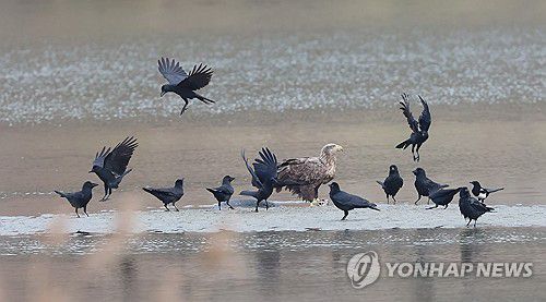 (강릉=연합뉴스) 유형재 기자 = 29일 강원 강릉시 남대천에서 환경부 멸종위기 야생생물 I급이자 천연기념물인 겨울 철새 흰꼬리수리가 사냥한 물고기를 먹으려는 순간 까마귀와 까치 등이 달려들어 텃세를 부리고 있다. 2025.12.29 yoo21@yna.co.kr ▶제보는 카카오톡 okjebo ▶연합뉴스 앱 지금 바로 다운받기~ ▶네이버 연합뉴스 채널 구독하