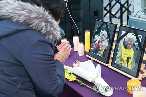 (서울=연합뉴스) 박영민 기자 = 31일 서울 종로구 주한 일본대사관 인근에서 열린 제1733차 일본군 성노예제 문제해결을 위한 정기 수요시위에서 한 시민이 길원옥ㆍ이옥선 할머니의 영정에 헌화한 뒤 손을 모아 추모하고 있다. 2025.12.31 ymp@yna.co.kr ▶제보는 카카오톡 okjebo ▶연합뉴스 앱 지금 바로 다운받기~ ▶네이버 연합뉴스 채널