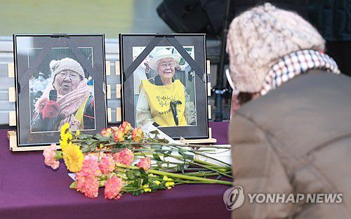 (서울=연합뉴스) 박영민 기자 = 31일 서울 종로구 주한일본대사관 인근에서 열린 제1733차 일본군성노예제 문제해결을 위한 정기 수요시위에서 한 시민이 길원옥ㆍ이옥선 할머니의 영정에 헌화한 뒤 고개를 숙여 추모하고 있다. 2025.12.31 ymp@yna.co.kr ▶제보는 카카오톡 okjebo ▶연합뉴스 앱 지금 바로 다운받기~ ▶네이버 연합뉴스 채널