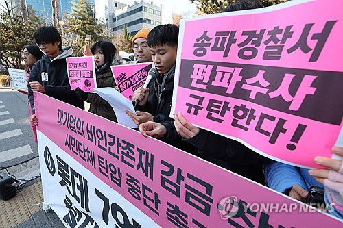 송파경찰서 앞 기자회견 하는 핫핑크돌핀스