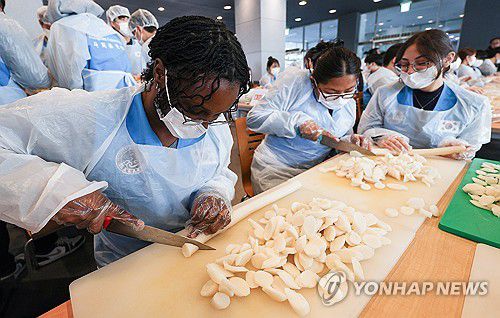 (경산=연합뉴스) 윤관식 기자 = 5일 경북 경산시 영남대학교 학생회관 식당에서 열린 '제5회 사랑의 떡국 나눔 행사'에 참여한 외국인 유학생과 영남대 봉사대 학생 등 100여명이 떡국 밀키트를 만들고 있다. 이날 만들어진 떡국 밀키트 660개는 경산의 어려운 이웃들에게 전달된다. 2026.1.5 psik@yna.co.kr ▶제보는 카카오톡 okjebo ▶