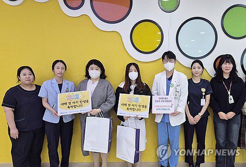 (춘천=연합뉴스) 5일 강원대학교병원에서 2026년 '새해둥이' 탄생 축하 행사가 열렸다. 앞서 새해 첫날인 지난 1일 오전 9시 55분께 병원 분만실에서 남아가 태어난 데 이어 같은 날 오전 11시 38분께 남아 한 명이 태어났다. 사진은 병원 의료진과 산모 등이 함께 기념 촬영을 하는 모습. 2026.1.5 [강원대학교병원 제공. 재판매 및 DB 금지]
