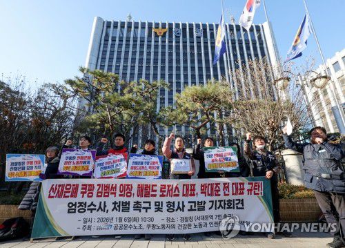 (서울=연합뉴스) 서명곤 기자 = 6일 서울 서대문구 경찰청 앞에서 민주노총 공공운수노조와 '쿠팡 노동자의 건강한 노동과 인권을 위한 대책위원회'가 연 기자회견에서 참가자들이 쿠팡 김범석 의장, 해럴드 로저스 대표, 박대준 전 대표에 대한 엄정 수사와 처벌을 촉구하는 구호를 외치고 있다. 이들은 고(故) 장덕준 씨 사망과 관련해 김범석 의장 등이 산업재해를