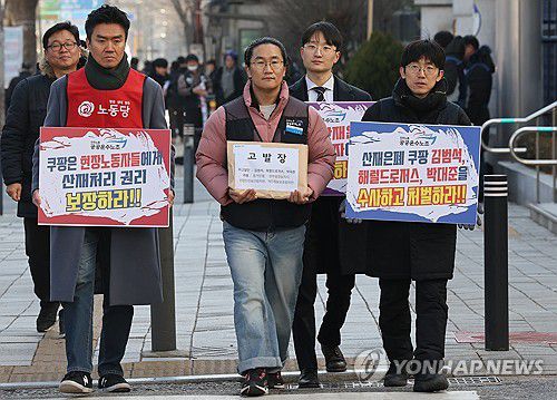 (서울=연합뉴스) 서명곤 기자 = 6일 서울 서대문구 경찰청 앞에서 민주노총 공공운수노조와 '쿠팡노동자의 건강한 노동과 인권을 위한 대책위원회'가 연 기자회견을 마친 참가자들이 고(故) 장덕준씨 사망과 관련해 김범석 쿠팡 의장 등이 산업재해를 은폐하려 했다며 경찰청에 고발장을 접수하기 위해 민원실로 향하고 있다. 2026.1.6 seephoto@yna.co