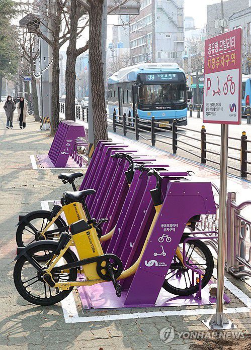 (부산=연합뉴스) 강선배 기자 = 7일 부산 남구의 한 도로변에 전동킥보드와 전기자전거 등 공유 모빌리티(PM)의 무단방치 해결을 위한 전용 주차구역이 조성돼 눈길을 끌고 있다. 이용률이 높은 경성대·부경대 인근 8개소에 조성된 주차구역은 전동킥보드와 전기자전거를 동시에 수용할 수 있는 공간으로 설계되었으며, 용이한 식별을 위해 표지판 설치와 노면 표시가