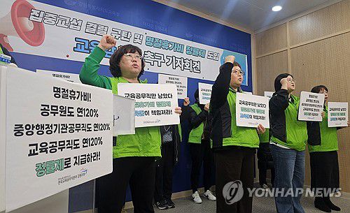 (춘천=연합뉴스) 양지웅 기자 = 8일 강원 춘천시 강원특별자치도교육청에서 열린 '명절휴가비 정률제 도입 촉구' 기자회견에서 전국교육공무직본부 강원지부원들이 휴가비 차별 중단을 촉구하는 구호를 외치고 있다. 이들은 "다른 행정 공무직들은 정률제를 적용해 기본급의 120%를 명절휴가비로 받고 있지만 교육공무직만 정액제를 적용받고 있다"며 "협상이 결렬되면 신