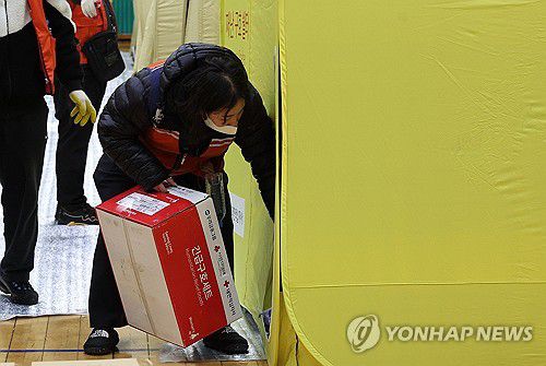 긴급구호 세트 배부하는 봉사자들