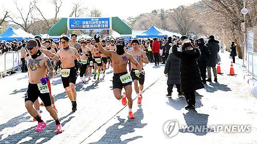 (제천=연합뉴스) 김형우 기자 = 11일 오전 충북 제천시 의림지와 삼한초록길 일원에서 열린 '제18회 제천 의림지 삼한초록길 알몸마라톤대회' 참가자들이 출발선을 뛰쳐나가고 있다. 제천시육상연맹 주최로 열린 이날 대회에는 전국 각지에서 1천여 명의 마라토너가 참가해 한겨울 추위 속 상의를 벗고 7㎞ 코스를 달렸다. 2026.1.11 vodcast@yna.c