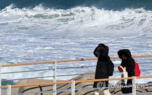(강릉=연합뉴스) 유형재 기자 = 11일 강풍·풍랑특보가 내려진 강원 동해안에 순간풍속 70km/h(산지 90km/h)의 강한 바람과 강릉 앞바다에 최고 3.5m의 거센 파도가 일고 있다. 2026.1.11 yoo21@yna.co.kr ▶제보는 카카오톡 okjebo ▶연합뉴스 앱 지금 바로 다운받기~ ▶네이버 연합뉴스 채널 구독하기 <저작권자(c) 연합뉴스