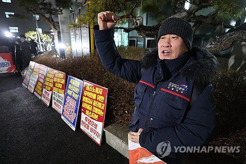 (서울=연합뉴스) 서대연 기자 = 서울 시내버스 노조 파업 예고일을 하루 앞두고 특별조정위원회 사후 조정회의가 열린 12일 서울 영등포구 서울지방노동위원회에서 전국민주노동조합총연맹(민주노총) 민주버스본부 서울지부 조합원들이 사측을 규탄하는 구호를 외치고 있다. 2026.1.12 dwise@yna.co.kr ▶제보는 카카오톡 okjebo ▶연합뉴스 앱 지금