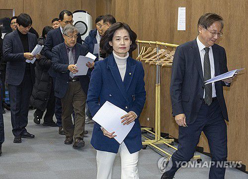 (서울=연합뉴스) 황광모 기자 = 검찰개혁 방향을 두고 정부와 여당을 비롯한 정치권의 의견이 엇갈리고 있는 14일 국회 소통관에서 조국혁신당 박은정 의원의 주선으로 검찰개혁 추진단 자문위원으로 참석했던 6명의 법조인과 교수들이 사퇴 기자회견을 하기 위해 입장하고 있다. 2026.1.14 hkmpooh@yna.co.kr ▶제보는 카카오톡 okjebo ▶연합뉴