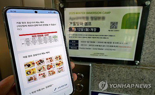 (서울=연합뉴스) 김성민 기자 = 각급 학교 방학과 맞벌이 학부모 증가 등으로 학원 내 돌봄 수요가 늘고 있는 가운데 14일 서울 시내 한 초등생 대상 영어학원에 겨울방학 캠프 안내문이 붙어 있다. 핸드폰에 표시되고 있는 화면은 해당 안내문에 붙어 있는 QR코드로 접속한 사이트에 있던 점심식사 예시 사진들. 2026.1.14 ksm7976@yna.co.kr