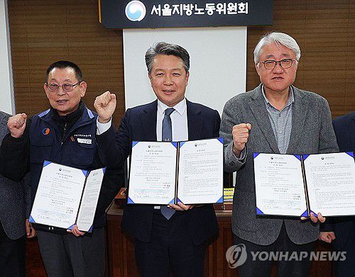 (서울=연합뉴스) 한종찬 기자 = 15일 서울지방노동위원회에서 열린 특별조정위원회 2차 사후 조정회의에서 박점곤 서울시버스노동조합(버스노조) 위원장과 사측인 김정환 서울시버스운송사업조합 이사장을 비롯한 참석자들이 노사 합의를 마치고 기념촬영을 하고 있다. 2026.1.15 saba@yna.co.kr ▶제보는 카카오톡 okjebo ▶연합뉴스 앱 지금 바로 다
