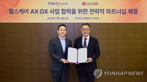 (서울=연합뉴스) 현신균 LG CNS CEO 사장(오른쪽)과 차원태 차바이오그룹 부회장이 14일 경기 성남시 판교 차바이오컴플렉스에서 열린 지분 투자 및 AX·DX 사업 협력을 위한 전략적 파트너십 협약식에서 기념 촬영하고 있다. 2026.1.15 [LG CNS 제공. 재판매 및 DB 금지] photo@yna.co.kr ▶제보는 카카오톡 okjebo ▶연합