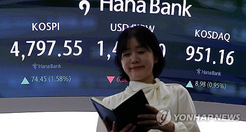(서울=연합뉴스) 김주형 기자 = 코스피가 열흘 연속 상승하며 4,800대 문턱에서 마감한 15일 서울 중구 하나은행 딜링룸 현황판에 코스피지수가 표시돼 있다. 코스피 지수는 전장 대비 12.82포인트(0.27%) 내린 4,710.28로 출발한 뒤 장 초반 등락하다가 상승세로 돌아서며 장중 고가에 마감했다. 전날 기록한 사상 최고가(4,723.10)를 재차