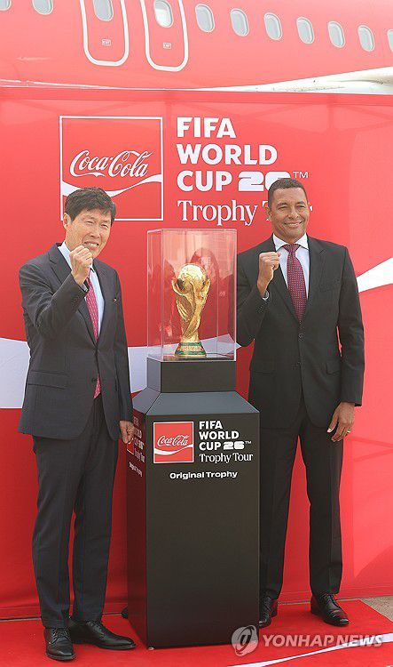 (서울=연합뉴스) 김주형 기자 = FIFA 전설적 인물인 전 브라질 축구 국가대표 선수 지우베르투 시우바가 'FIFA 월드컵™ 트로피 투어 by 코카-콜라' 일정으로 방한해 차범근 전 감독(왼쪽)과 FIFA 월드컵 오리지널 트로피 앞에서 기념 촬영을 하며 파이팅 하고 있다. 2026.1.16 kjhpress@yna.co.kr ▶제보는 카카오톡 okjebo