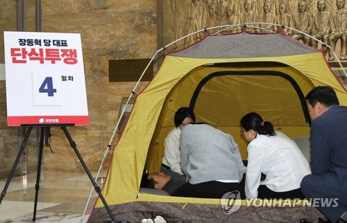 (서울=연합뉴스) 배재만 기자 = 18일 더불어민주당에 통일교·공천헌금 '쌍특검' 수용을 요구하며 국회 로텐더홀에서 나흘째 단식 투쟁을 이어가고 있는 국민의힘 장동혁 대표가 의료진의 진찰을 받고 있다. 2026.1.18 scoop@yna.co.kr ▶제보는 카카오톡 okjebo ▶연합뉴스 앱 지금 바로 다운받기~ ▶네이버 연합뉴스 채널 구독하기 <저작권자(