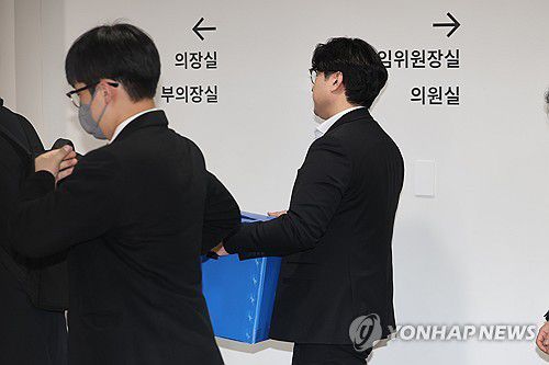 (서울=연합뉴스) 서대연 기자 = 경찰이 더불어민주당 김병기 의원 부인의 업무추진비 유용 의혹과 관련해 동작구의회 등을 압수수색 중인 19일 서울 동작구의회에서 경찰 관계자들이 압수품을 옮기고 있다. 2026.1.19 dwise@yna.co.kr ▶제보는 카카오톡 okjebo ▶연합뉴스 앱 지금 바로 다운받기~ ▶네이버 연합뉴스 채널 구독하기 <저작권자(c