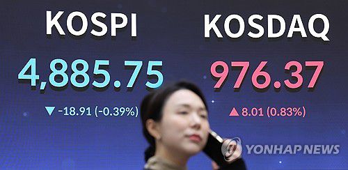 (서울=연합뉴스) 김주형 기자 = 코스피가 내림세로 돌아선 20일 서울 영등포구 한국거래소 홍보관 현황판에 코스피와 코스닥 지수가 표시돼 있다. 이날 코스피는 전장보다 18.91포인트(0.39%) 내린 4,885.75에 장을 마쳤다. 새해 들어 하루도 빠짐없이 상승하던 코스피는 13거래일 만에 하락세로 돌아섰다. 코스닥은 전장보다 8.01포인트(0.83%)