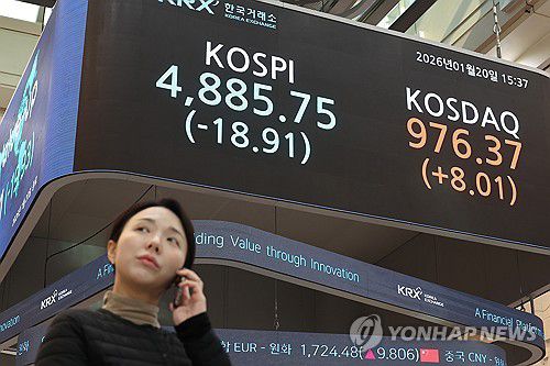 (서울=연합뉴스) 김주형 기자 = 코스피가 내림세로 돌아선 20일 서울 영등포구 한국거래소 홍보관 현황판에 코스피와 코스닥 지수가 표시돼 있다. 이날 코스피는 전장보다 18.91포인트(0.39%) 내린 4,885.75에 장을 마쳤다. 새해 들어 하루도 빠짐없이 상승하던 코스피는 13거래일 만에 하락세로 돌아섰다. 코스닥은 전장보다 8.01포인트(0.83%)