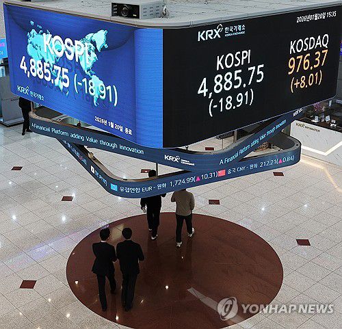 (서울=연합뉴스) 김주형 기자 = 코스피가 내림세로 돌아선 20일 서울 영등포구 한국거래소 홍보관 현황판에 코스피와 코스닥 지수가 표시돼 있다. 이날 코스피는 전장보다 18.91포인트(0.39%) 내린 4,885.75에 장을 마쳤다. 새해 들어 하루도 빠짐없이 상승하던 코스피는 13거래일 만에 하락세로 돌아섰다. 코스닥은 전장보다 8.01포인트(0.83%)