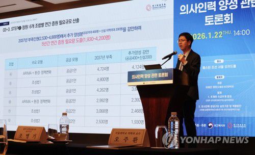 (서울=연합뉴스) 이진욱 기자 = 22일 서울 중구 웨스틴조선호텔에서 열린 에서 신현웅 한국보건사회연구원 보건의료정책연구실장이 의사인력 양성규모 심의기준 및 적용방안에 대해 발표하고 있다. 2026.1.22 cityboy@yna.co.kr ▶제보는 카카오톡 okjebo ▶연합뉴스 앱 지금 바로 다운받기~ ▶네이버 연합뉴스 채널 구독하기 <저작권자(c) 연합