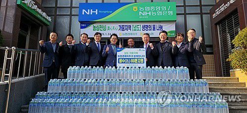 (완도=연합뉴스) 24일 농협완도군지부 관계자들이 겨울 가뭄으로 식수난을 겪고 있는 전남 완도군 노화읍 넙도에 생수 80톤을 전달하며 기념사진을 찍고 있다. 2026.1.24 [박지원 의원실 제공. 재판매 및 DB 금지] in@yna.co.lr ▶제보는 카카오톡 okjebo ▶연합뉴스 앱 지금 바로 다운받기~ ▶네이버 연합뉴스 채널 구독하기 <저작권자(c)
