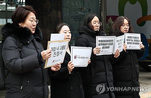 (서울=연합뉴스) 김인철 기자 = 26일 서울 중구 서울지방고용노동청 앞에서 여성노동법률지원센터 관계자들이 보건복지부 산하 공공기관 간부의 '직장 내 괴롭힘·부당업무지시' 진정서 제출 기자회견을 하고 있다. 2026.1.26 yatoya@yna.co.kr ▶제보는 카카오톡 okjebo ▶연합뉴스 앱 지금 바로 다운받기~ ▶네이버 연합뉴스 채널 구독하기 <저