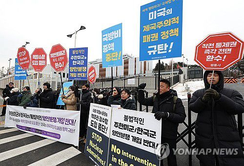 (서울=연합뉴스) 이지은 기자 = 안규백 국방부 장관과 엘브리지 콜비 미국 국방부(전쟁부) 정책담당 차관이 면담을 한 가운데 26일 서울 용산구 국방부 앞에서 평화와통일을여는사람들 회원들이 규탄 기자회견을 열고 구호를 외치고 있다. 2026.1.26 jieunlee@yna.co.kr ▶제보는 카카오톡 okjebo ▶연합뉴스 앱 지금 바로 다운받기~ ▶네이버