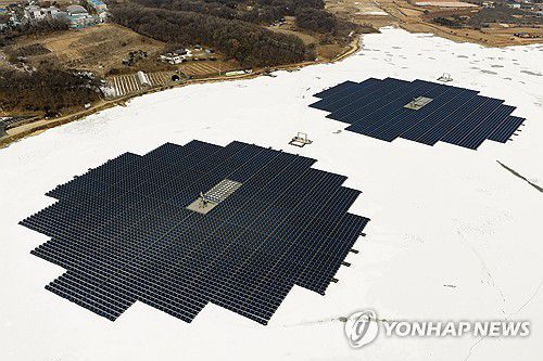 얼어붙은 저수지 속 수상태양광발전소
