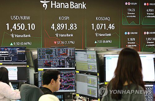 (서울=연합뉴스) 김주형 기자 = 한국산 제품에 대한 관세를 무역합의 이전으로 되돌리겠다는 도널드 트럼프 미국 대통령의 발언에 코스피가 하락 출발했다. 27일 서울 중구 하나은행 본점 딜링룸에서 직원들이 증시와 환율을 모니터하고 있다. 코스피 지수는 전장보다 16.70포인트(0.34%) 내린 4,932.89로 개장한 이후 낙폭을 키우는 모양새다. 코스닥은
