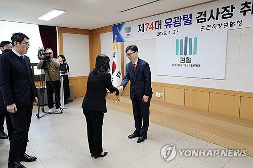 (춘천=연합뉴스) 박영서 기자 = 유광렬(54·사법연수원 33기) 신임 춘천지방검찰청장이 27일 오전 강원 춘천지검 대회의실에서 열린 취임식에서 직원들과 인사를 나누고 있다. 2026.1.27 conanys@yna.co.kr ▶제보는 카카오톡 okjebo ▶연합뉴스 앱 지금 바로 다운받기~ ▶네이버 연합뉴스 채널 구독하기 <저작권자(c) 연합뉴스, 무단 전