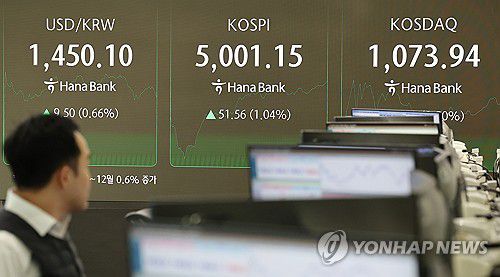 (서울=연합뉴스) 김주형 기자 = 한국산 제품에 대한 관세를 무역합의 이전으로 되돌리겠다는 도널드 트럼프 미국 대통령의 발표에 27일 하락 출발한 코스피가 장중 5000포인트를 넘어서고 있다. 서울 중구 하나은행 본점 딜링룸에서 직원들이 증시와 환율을 모니터하고 있다. 2026.1.27 kjhpress@yna.co.kr ▶제보는 카카오톡 okjebo ▶연합