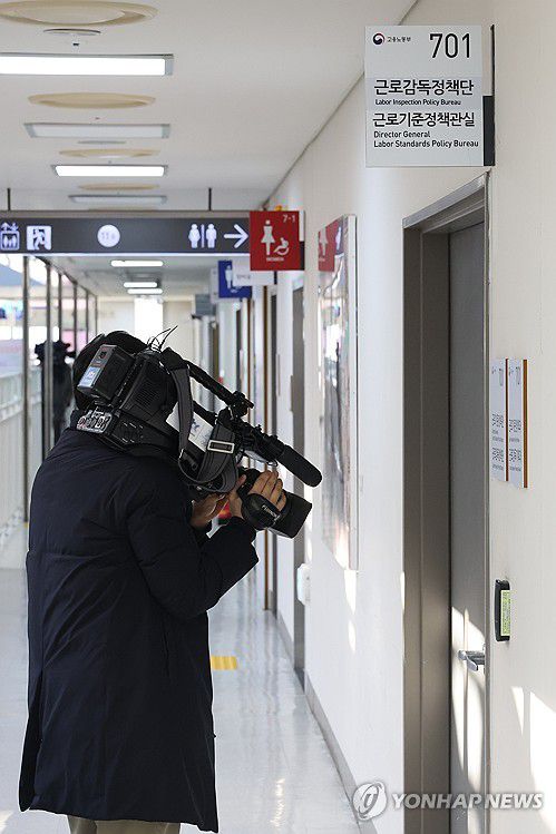 (세종=연합뉴스) 김주성 기자 = 27일 '쿠팡 퇴직금 미지급 의혹'을 수사하는 안권섭 상설특별검사팀이 압수수색을 진행 중인 정부세종청사 내 고용노동부 근로기준정책과 앞에서 기자들이 취재를 하고 있다. 이날 오전 특검팀은 근로자퇴직급여 보장법(퇴직금법) 위반, 직권남용 권리행사 방해 등 혐의로 고용노동부 세종청사의 근로기준정책과와 퇴직연금복지과, 서울지방고