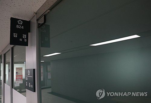 (서울=연합뉴스) 신준희 기자 = 공천헌금 의혹에 이어 서울 강서구청장 출마 로비 의혹으로 경찰 수사를 받고 있는 김경 서울시의원이 사퇴 의사를 밝힌 가운데 27일 중구 서울시의회 별관에 위치한 김 의원 연구실에 불이 꺼져 있다. 2026.1.27 hama@yna.co.kr ▶제보는 카카오톡 okjebo ▶연합뉴스 앱 지금 바로 다운받기~ ▶네이버 연합뉴스