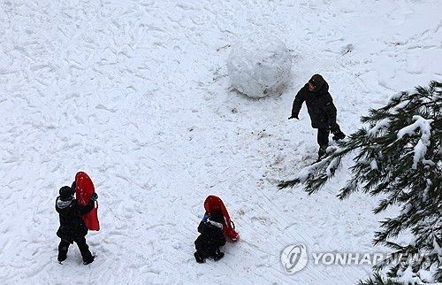 (강릉=연합뉴스) 유형재 기자 = 강원 동해안에 이번 겨울 들어 눈다운 눈이 처음으로 내린 16일 강릉시 교동 솔올택지의 한 공원에서 아이들이 아빠와 함께 눈싸움하며 즐거운 설 연휴를 보내고 있다. 이날 강원 동해안과 산간에는 대설특보가 발효된 가운데 최고 10㎝ 넘는 눈이 내리고 있다. 2026.2.16 yoo21@yna.co.kr ▶제보는 카카오톡 ok
